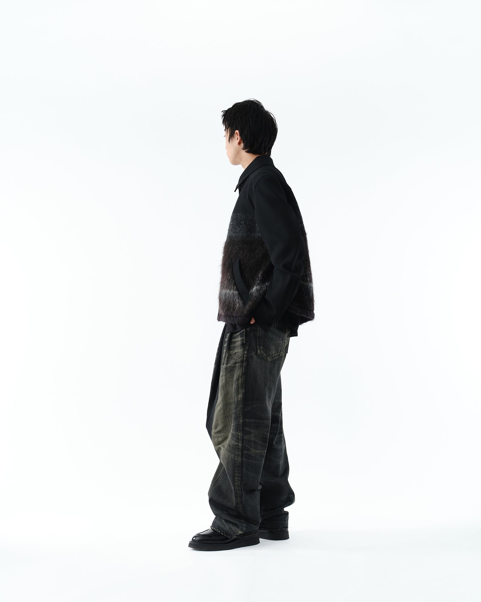 ウール仕立ての端正なブルゾンから、ニットへと質感が切り替わることで、唯一無二の立体感と柔らかさを演出。