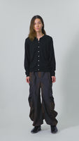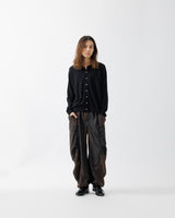 90年代のデニムパンツに着想を得た構築的なカッティングと、内側にカーブした独特のパターンワークが融合し、まるで”着る彫刻”のような立体的なフォルムを実現。