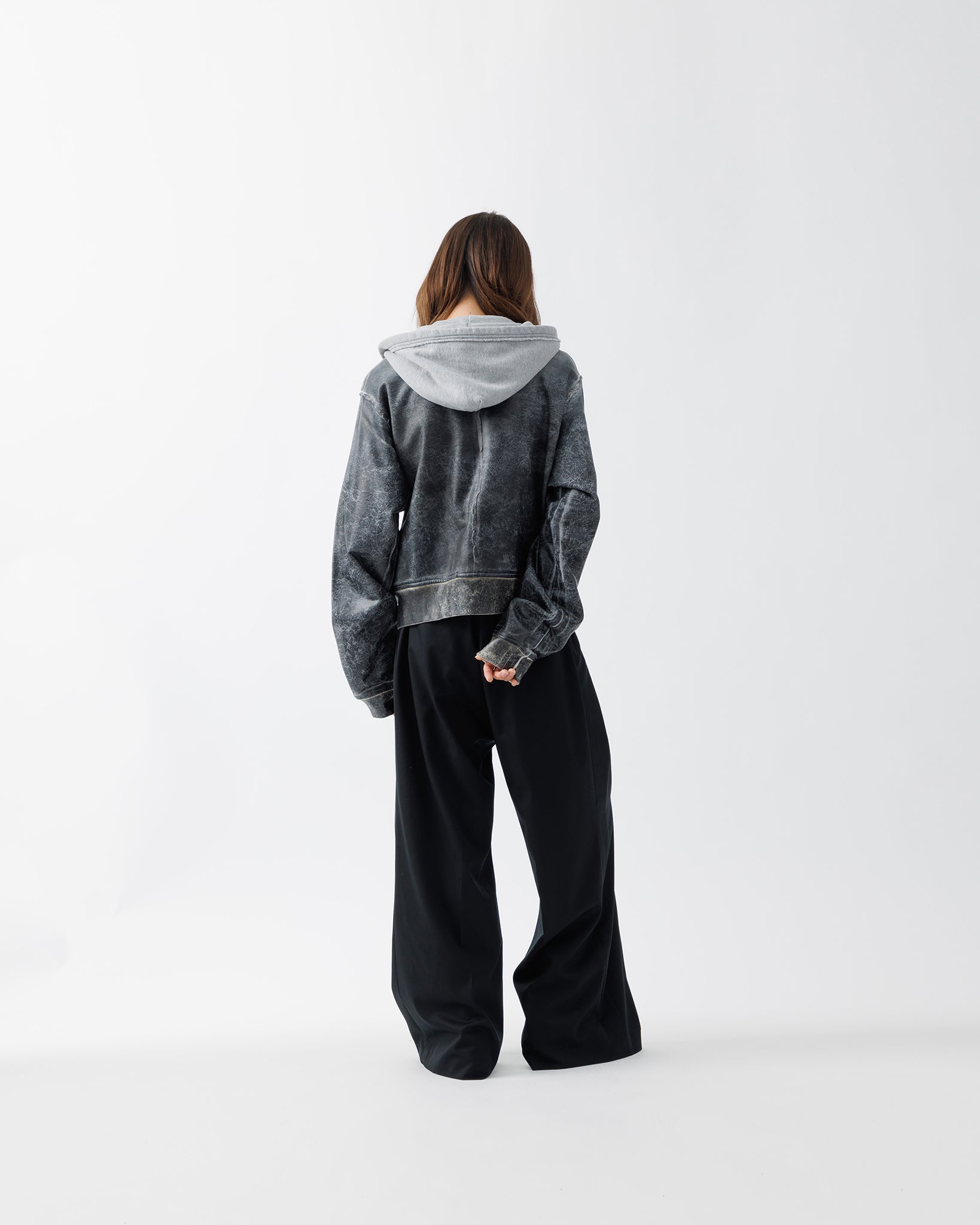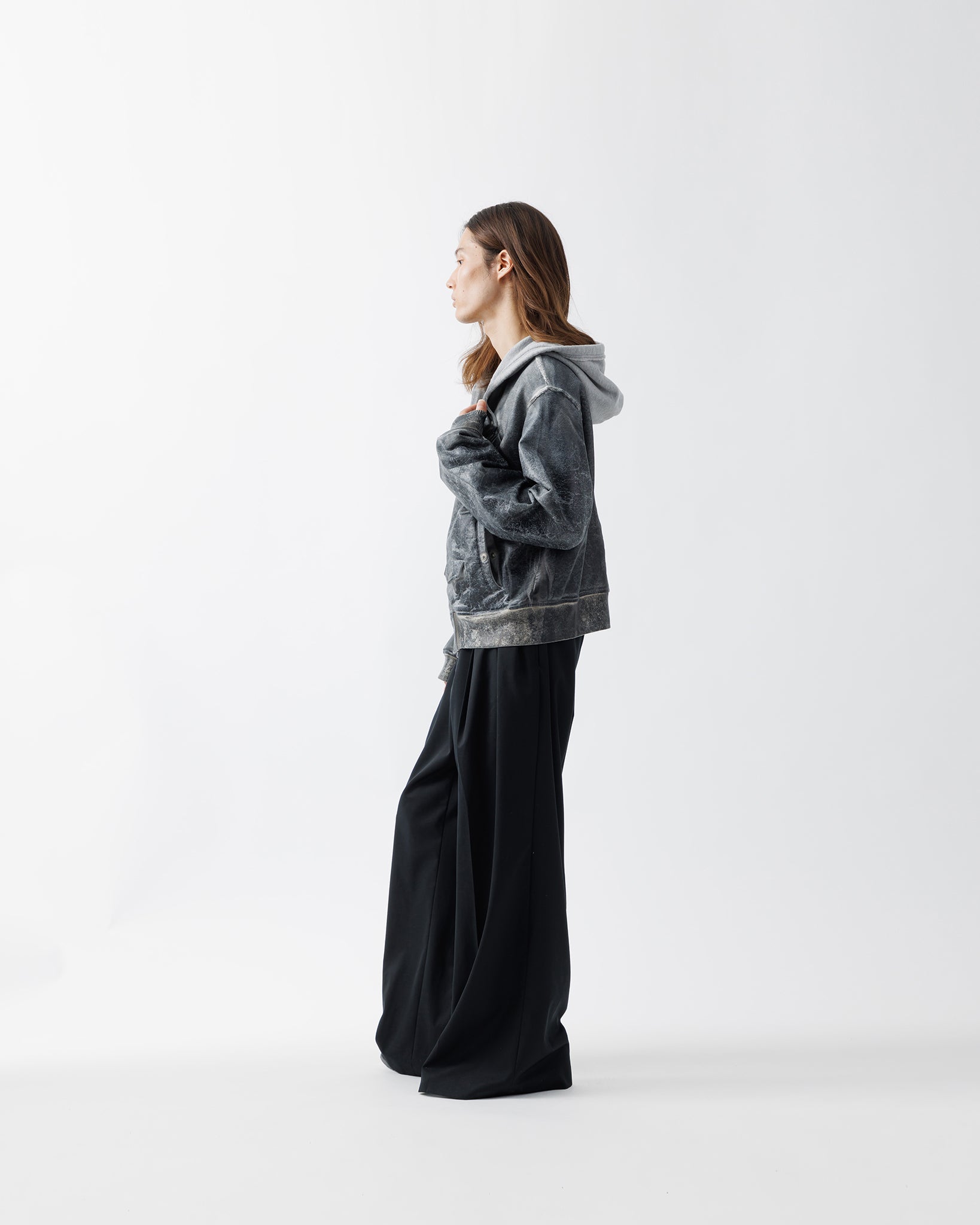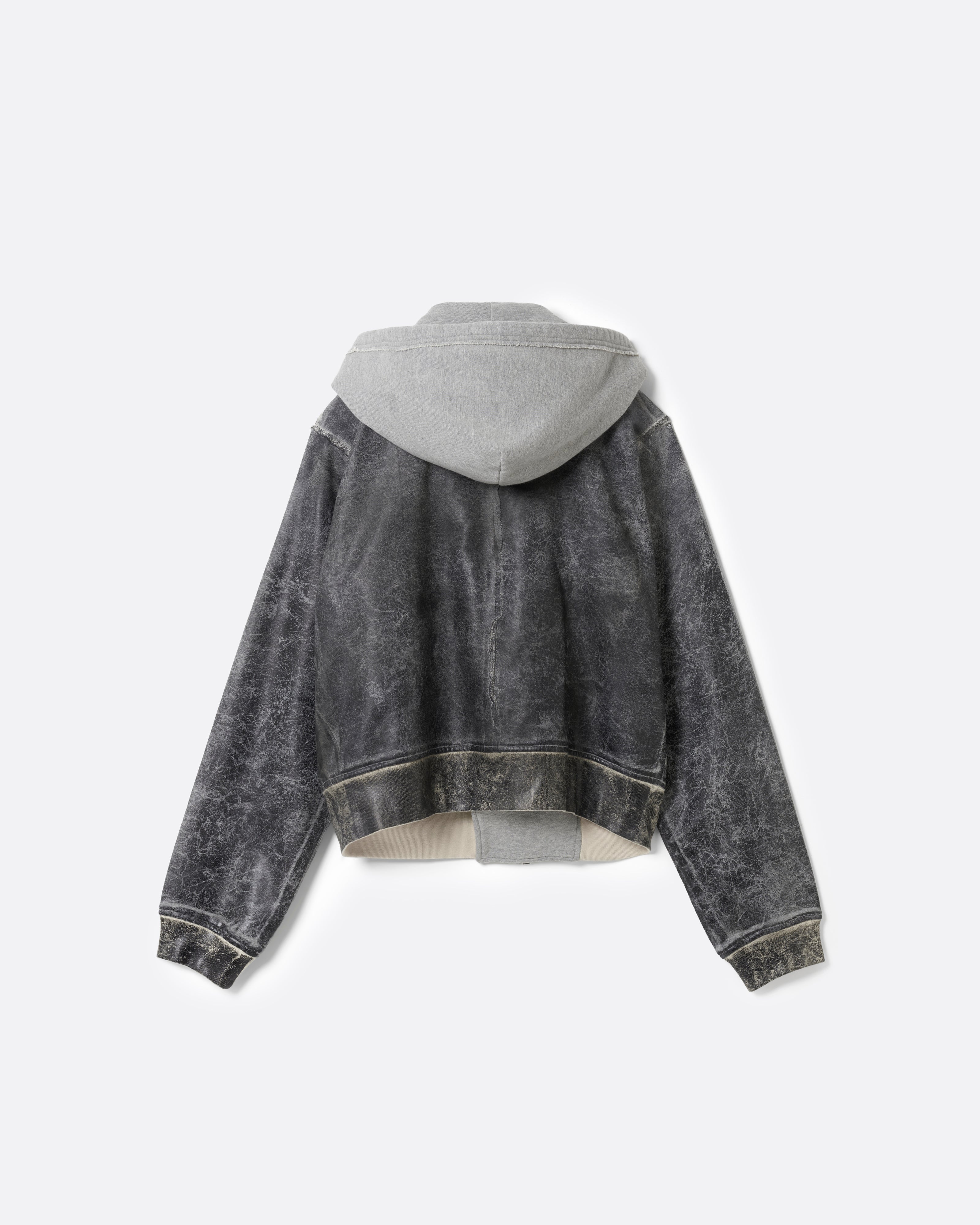 肩から裾までのボディ上部には、レザークラッキング調のコーティングを施し、フーディとスウェットが徐々に融合していくようなグラデーションを演出。