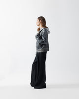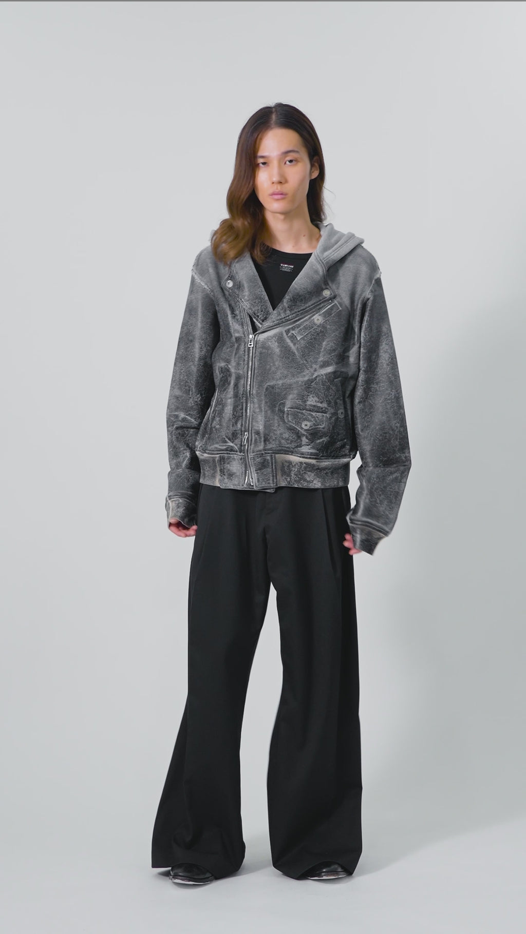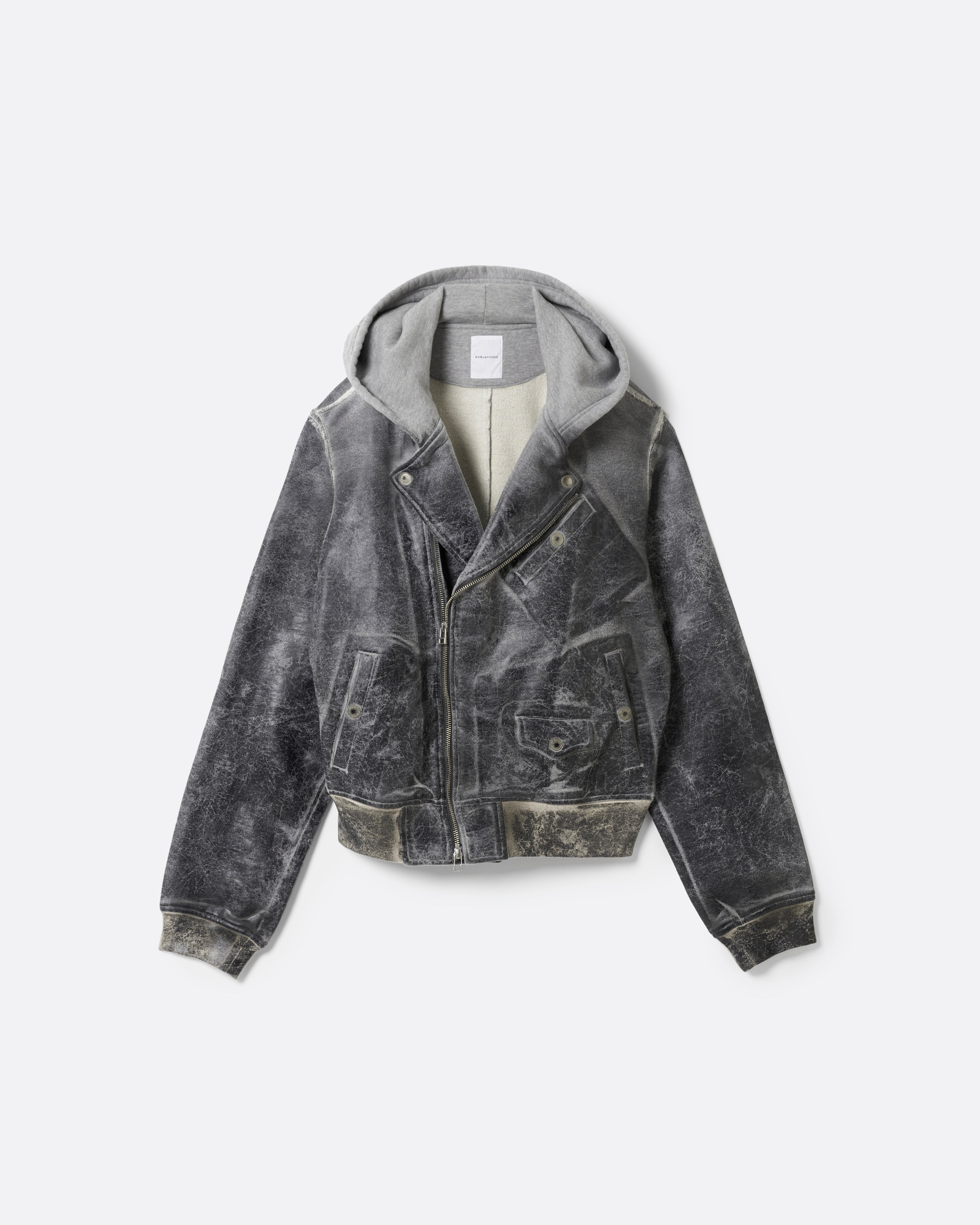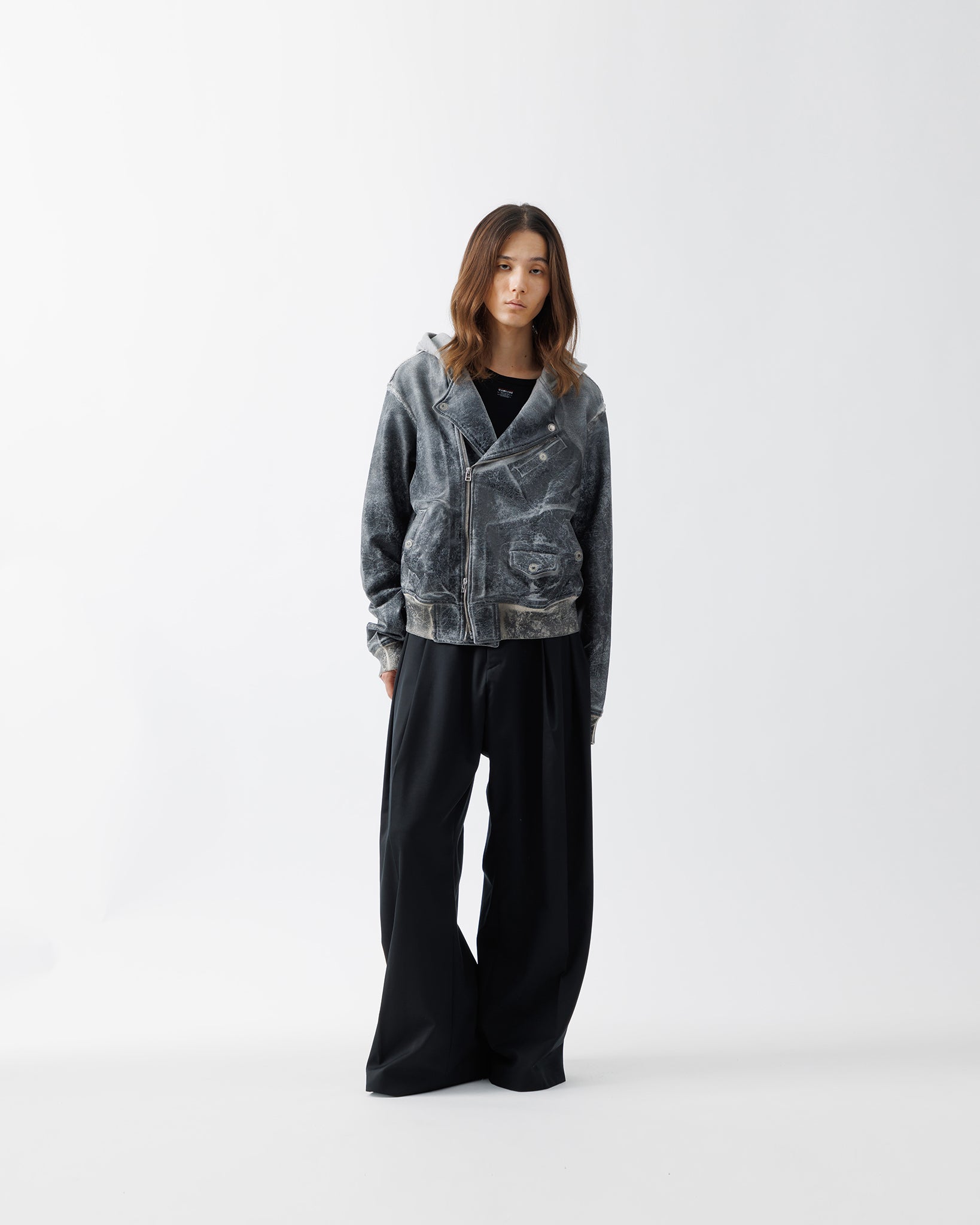 肩から裾までのボディ上部には、レザークラッキング調のコーティングを施し、フーディとスウェットが徐々に融合していくようなグラデーションを演出。