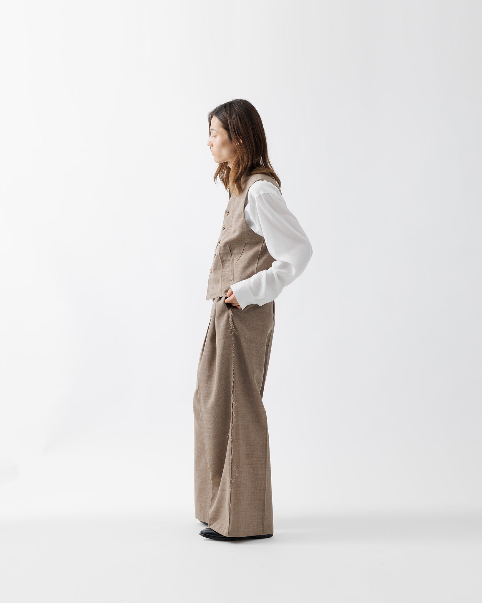 サイドシームには切りっぱなし仕様を採用し、モードな印象を保ちつつも、ドレスにもカジュアルにも溶け込むニュアンスを纏っています。