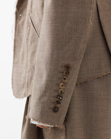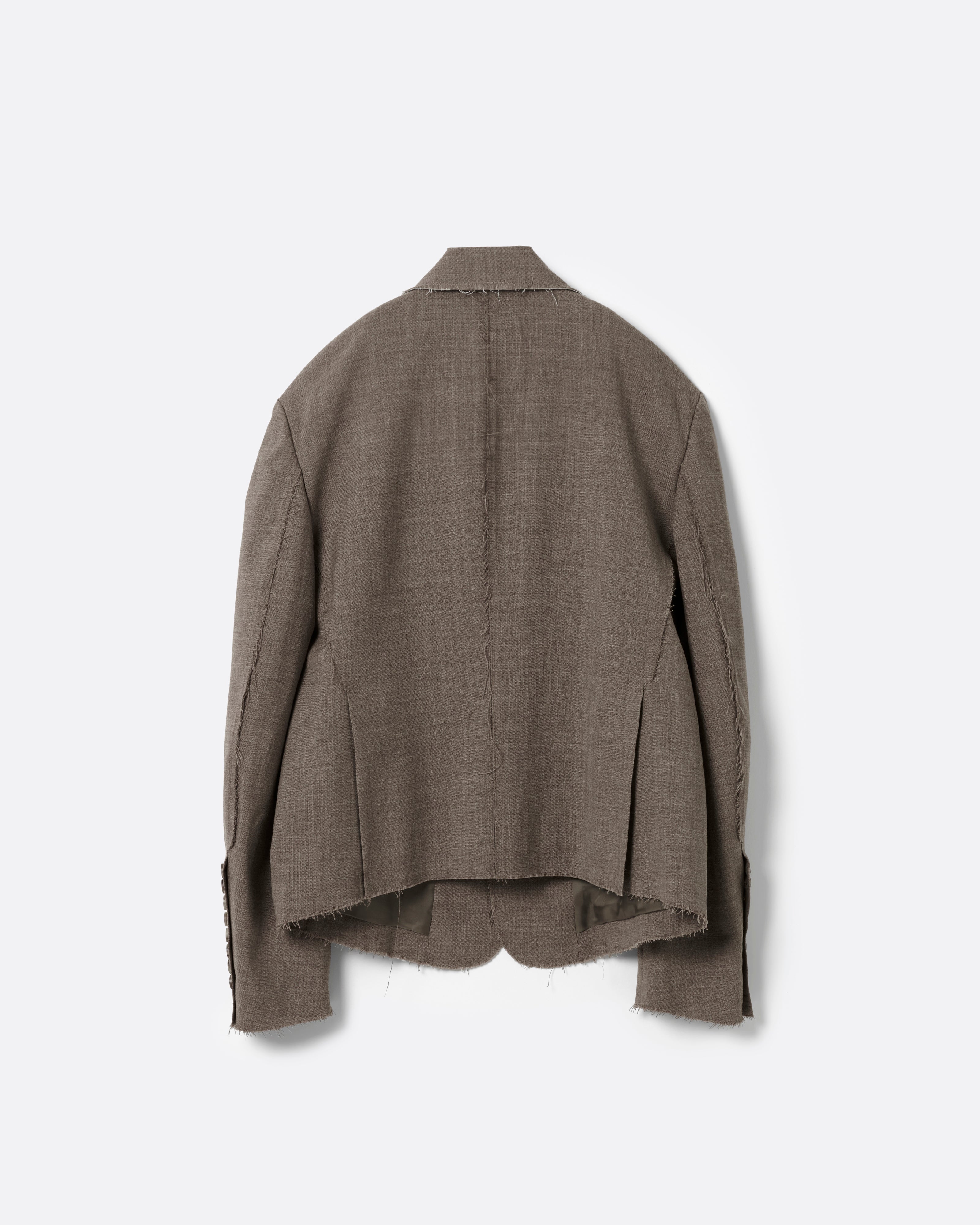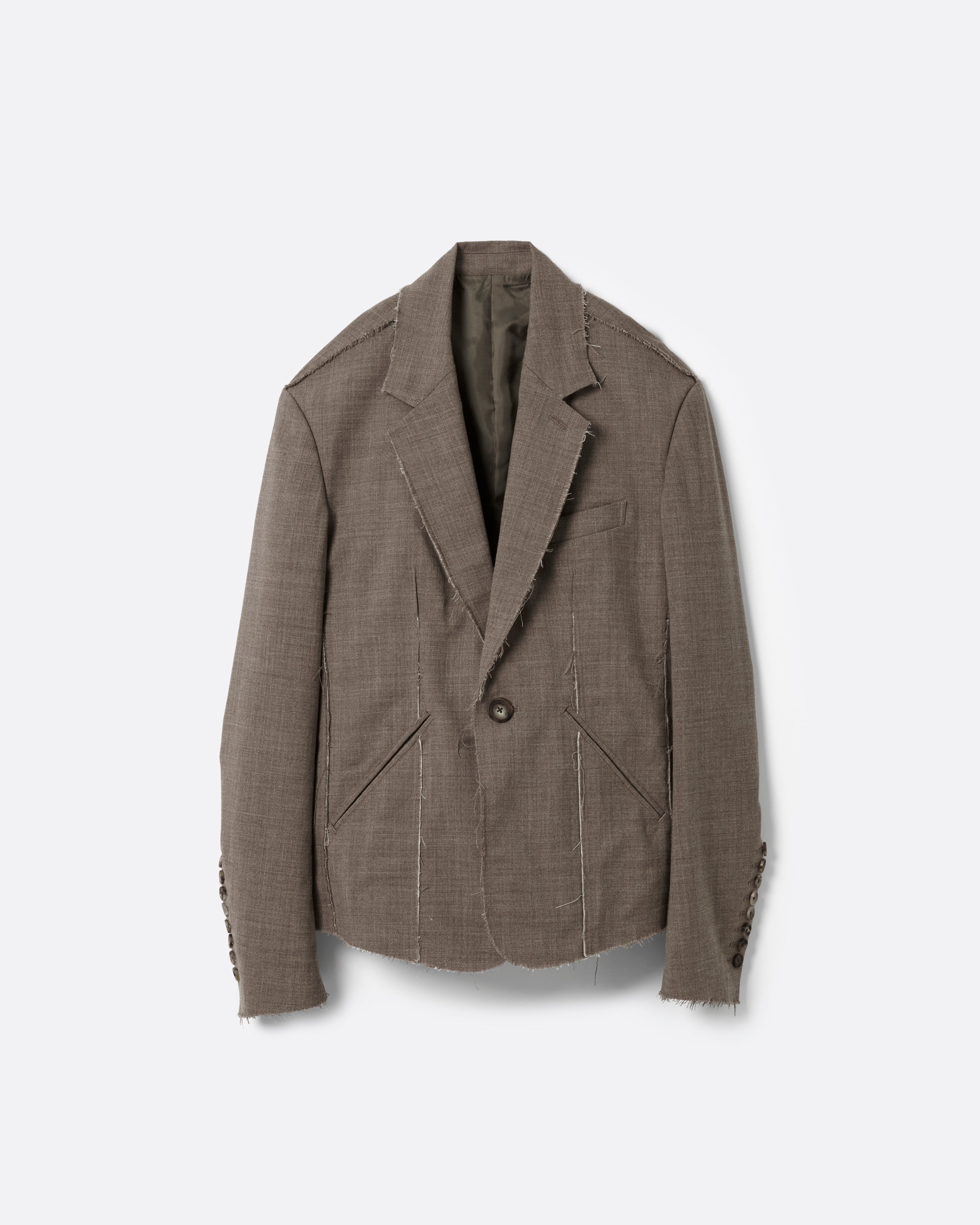 正統派のテーラリングをベースにしながらも、芯地を省いたアンコン仕立てや大胆な切りっぱなし仕様、短丈デザインによって、軽やかで現代的なムードを纏った一着に昇華されています。